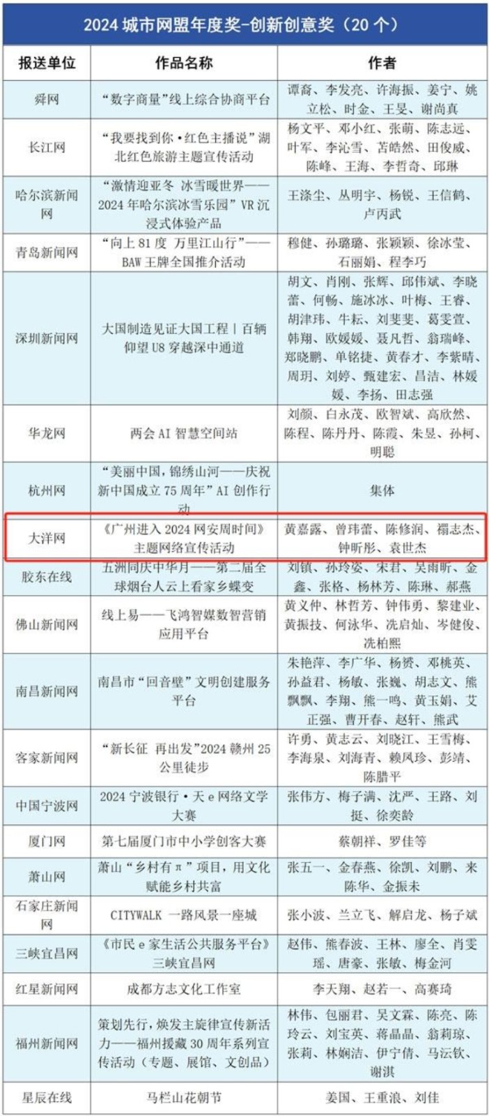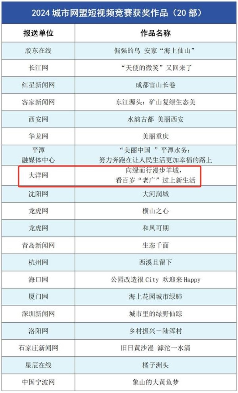 会上公布了2024城市网盟短视频竞赛获奖作品和“美丽中国锦绣山河”AI创作优秀作品名单,颁发了2024年度中国城市网盟奖。其中,粤传媒旗下大洋网荣获多个奖项,大洋网获“城市网盟年度团队奖”;《向绿而行漫步羊城,看百岁“老广”过上新生活》获年度竞赛最佳短视频奖;《潮起湾区 粤见未来》获“城市网盟年度作品/产品奖”;《<广州进入 2024 网安周时间>主题网络宣传活动》获“城市网盟年度创新创意奖”。