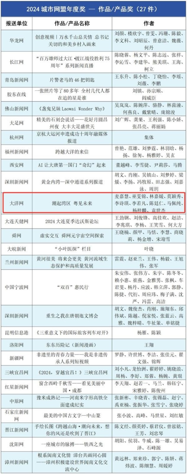 中国城市新闻网媒联盟是由具有国家级和省级新闻采编发布资质的城市新闻网站建立的交流协作机制。目前,城市网盟成员单位已有100多家,汇聚了各地最专业的新闻网站、APP,以及头条、抖音、视频号等新媒体矩阵,累计粉丝总量突破5亿。2024年是中国城市新闻网媒联盟成立20周年,也是多数地方新闻网媒成立20年的时间节点。为了全面展示我国城市新闻网媒20年创新发展成果,大会还颁发了“城市新闻网媒(2004-2024)20年特别奖”,大洋网《潮起湾区 韵动岭南》作品获奖。