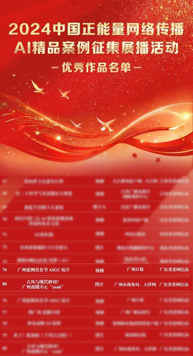 近日,2024中国正能量网络传播AI精品案例征集展播活动优秀作品及优秀组织单位正式公布,粤传媒旗下广州广粤文化发展有限公司(简称“广粤文化”)与广州日报新媒体有限公司共同打造的AI视频作品《广州亚洲美食节AIGC短片》、广州市商务局与广州市交互式信息网络有限公司(简称“大洋网”)携手创作的AI交互作品《古风与现代秒切!广州商圈不知“yeah”》入选。